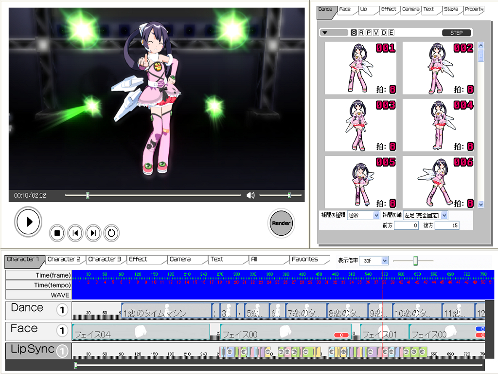 好きな曲に合わせて自分の作ったキャラクターを自由に躍らせることができます。