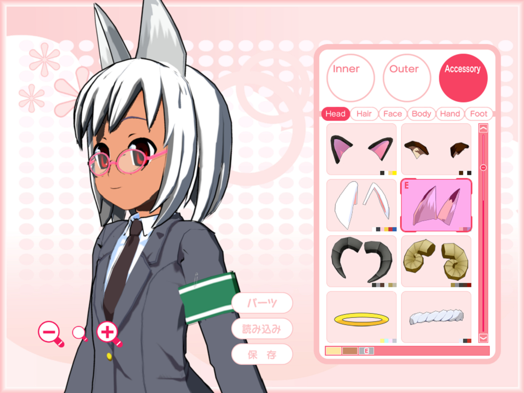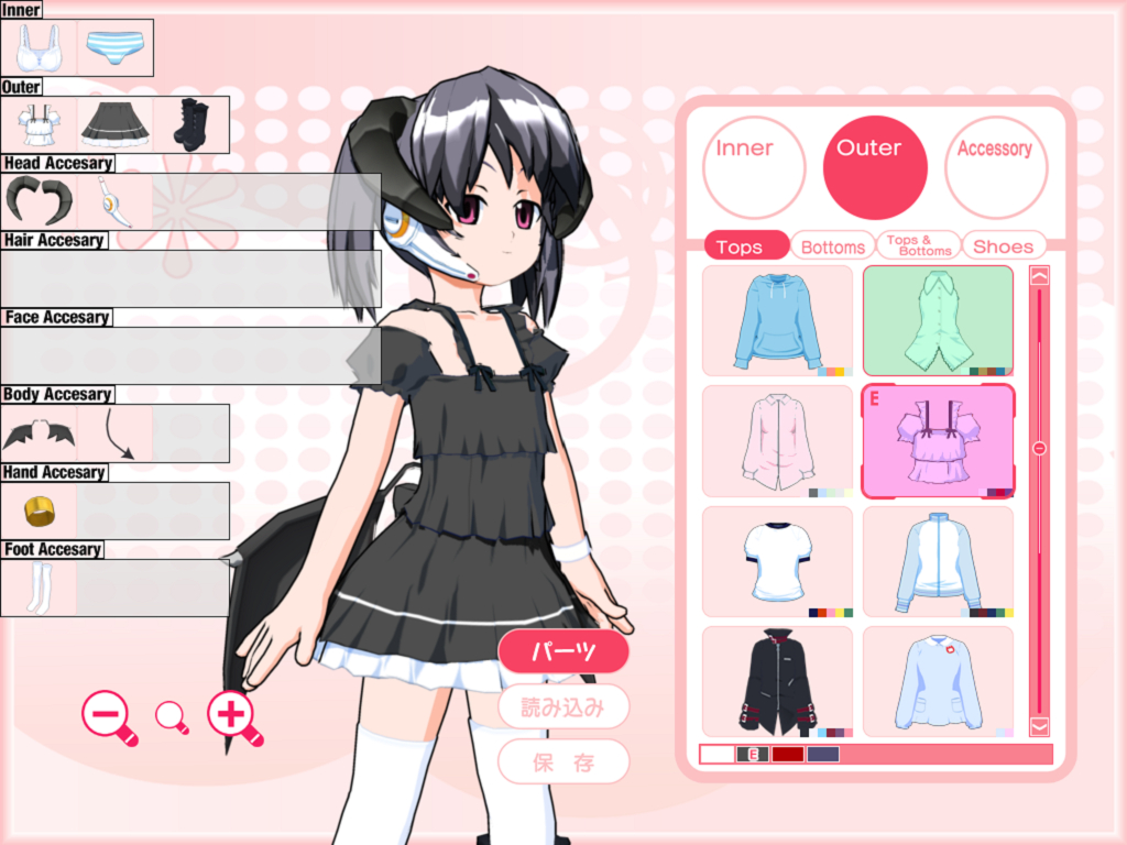 キャラクターができたら次は衣装の選択です。 好きな服で着飾りましょう。 衣装の種類は下着・上着・靴・アクセサリー。 下着と上着は上・下もしくは上下のセット。 アクセサリーは頭・髪・顔・体・手・足のそれぞれに装着可能です。 また、アクセサリーはひとつの場所に複数装着することもできます。 アイテムによっては色を変更することも可能。 このように好きにカスタマイズしたキャラクターを動かせるのが Dance×Mixerの魅力のひとつです。